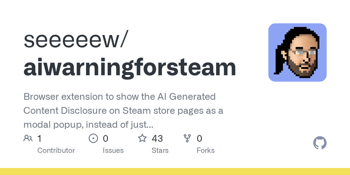 arrow-up137arrow-down1external-linkBrowser extension to show the AI Generated Content Disclosure on Steam store pages as a modal popup, instead of just at the end of the page. - GitHub - seeeeew/aiwarningforsteamplus-squaregithub.comA Mouse@midwest.socialEnglish · 16 days agomessage-square0linkfedilink