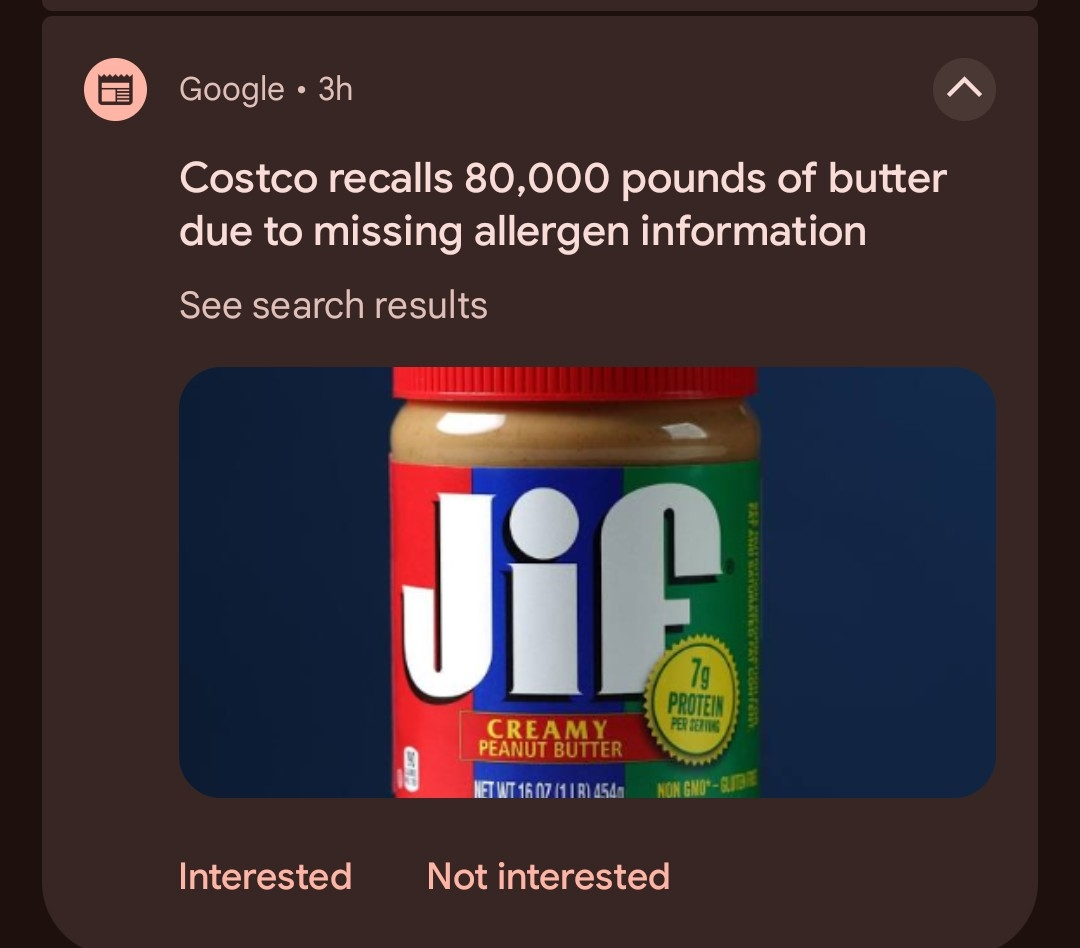 Costco article has nothing to do with PB but I’m betting the AI is showing me a picture of allergic butter. Frankly dangerous.