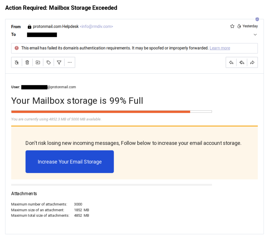 Your Mailbox storage is 99% full