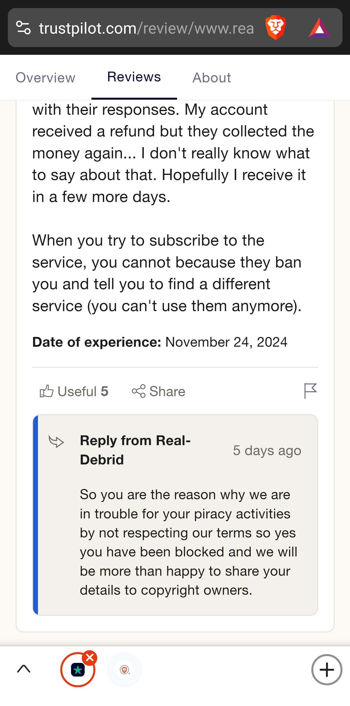 Hopefully they will get what they deserve, at the very least get their Trustpilot banned and lose any and all appearance of being a good and not shady business it gives them. Because they are a shady and not legitimate business, they don’t act like one, and their service doesn’t have any practical usage that isn’t related to piracy. Seriously the legal usage of Debrid services is so niche that if that were all you could do with them we probably wouldn’t have them at all.