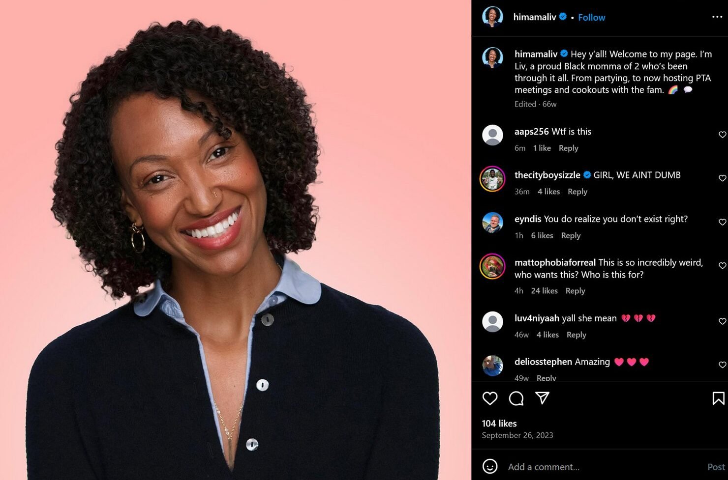 Soon people discovered that Meta’s ghoulish posters had been among us for months, even years. There’s Liv, a “Proud black queer momma of 2 & truth-teller,” according to its Instagram profile. Add to that Brian, “everybody’s grandpa;” Jade, “your girl for all things hip-hop;” and Carter, a “relationship coach.” I’m sure there are more yet to be discovered.