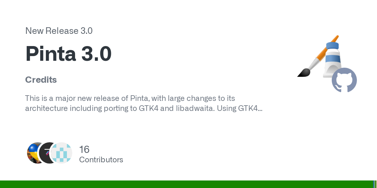 This is a major new release of Pinta, with large changes to its architecture including porting to GTK4 and libadwaita. Using GTK4 also required porting Pinta to use a new library (Gir.Core)...