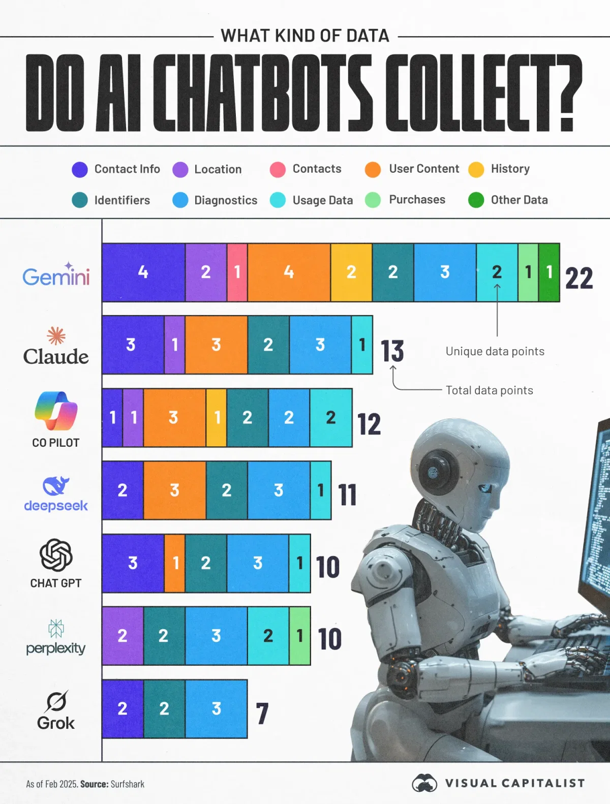 A chart titled “What Kind of Data Do AI Chatbots Collect?” lists and compares seven AI chatbots—Gemini, Claude, CoPilot, Deepseek, ChatGPT, Perplexity, and Grok—based on the types and number of data points they collect as of February 2025. The categories of data include: Contact Info, Location, Contacts, User Content, History, Identifiers, Diagnostics, Usage Data, Purchases, Other Data.
