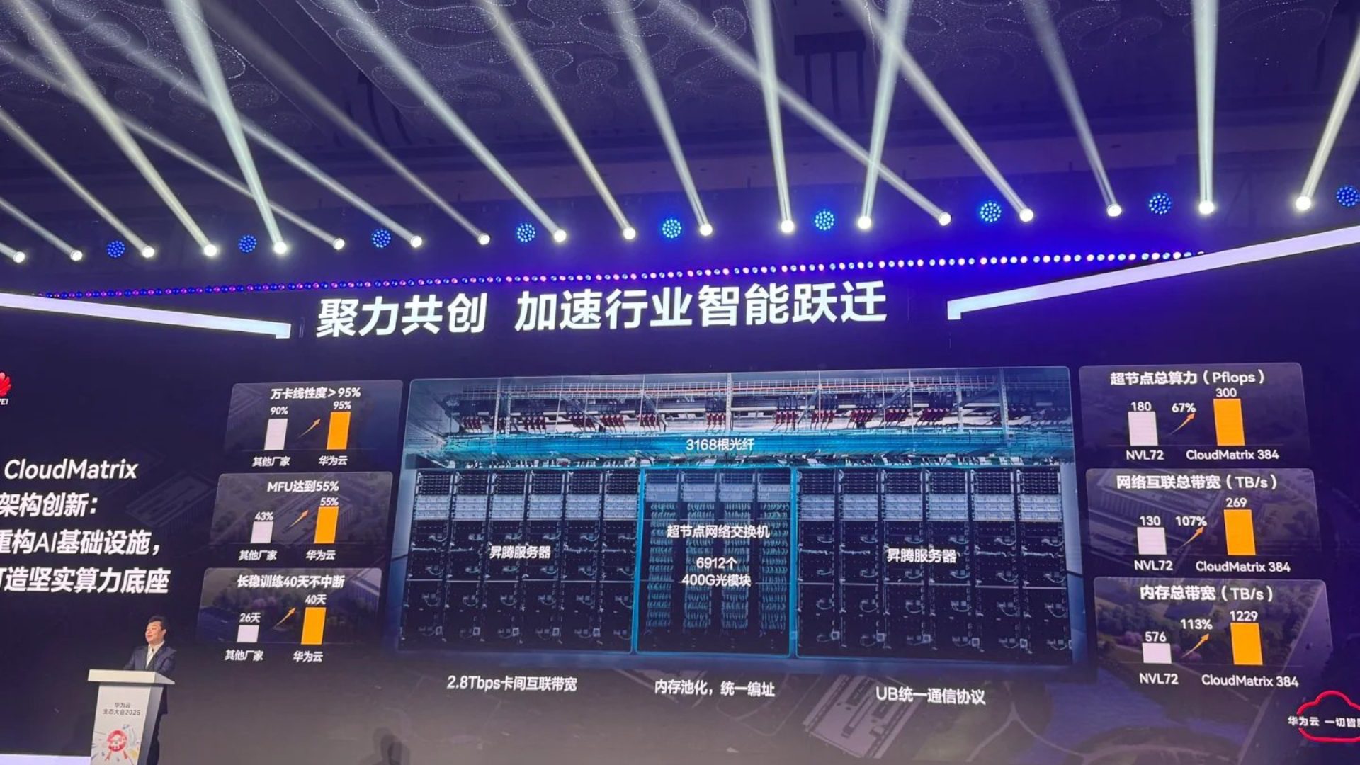 Huawei’s official presentation claims their Cloudmatrix 385 supercomputer delivers 300 PFLOPS of computing power, 269 TB/s of network bandwidth, and 1,229 TB/s of total memory bandwidth. It also achieves 55 percent model fitting utilization (MFU) during training workloads and offers 2.8 Tbps of inter-card bandwidth, heavily emphasizing its strength in networking.