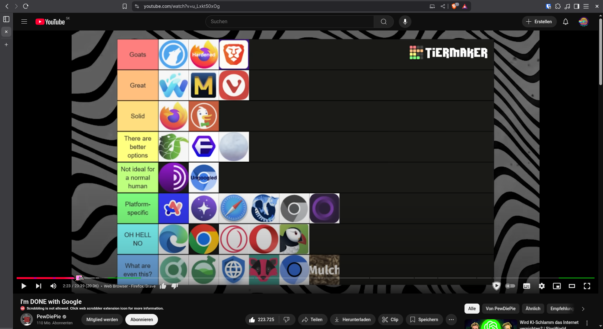 arrow-up153arrow-down1imagePewDiePie's tierlist of browserslemmy.mlMatt@lemmy.ml to Privacy@lemmy.ml · 4 months agomessage-square140linkfedilinkfile-textcross-posted to: privacy@lemmy.dbzer0.com