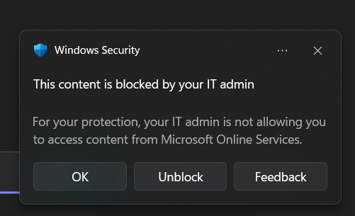 Edit: title, it turns out it’s the Info Sec team who went a bit overboard with the block listing.