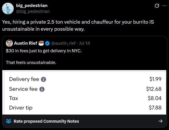 What’s more ridiculous? 10 people each driving to the fast food joint individually or one delivery driver making a round trip to 10 people?