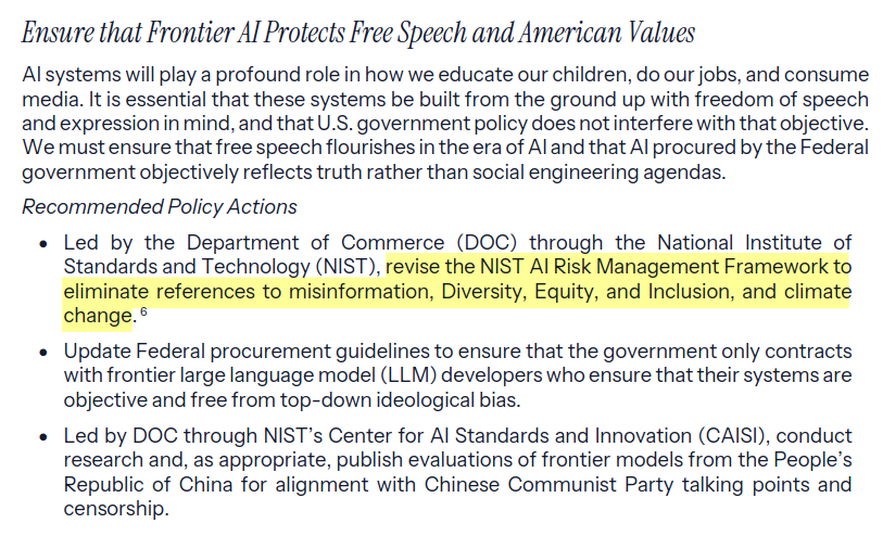 The Trump administration recently published “America’s AI Action Plan”. One of the first policy actions from the document is to eliminate references to misinformation, diversity, equity, inclusion, and climate change from the NIST’s AI Risk Framework.