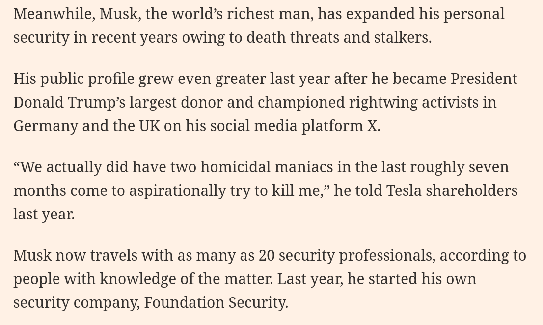 Davriellelouna@lemmy.world to Today I Learned@lemmy.worldEnglish · edit-22 months agoTIL Elon Musk travels with as many as 20 bodyguardslemmy.worldimagemessage-square165linkfedilinkarrow-up1633arrow-down111file-text