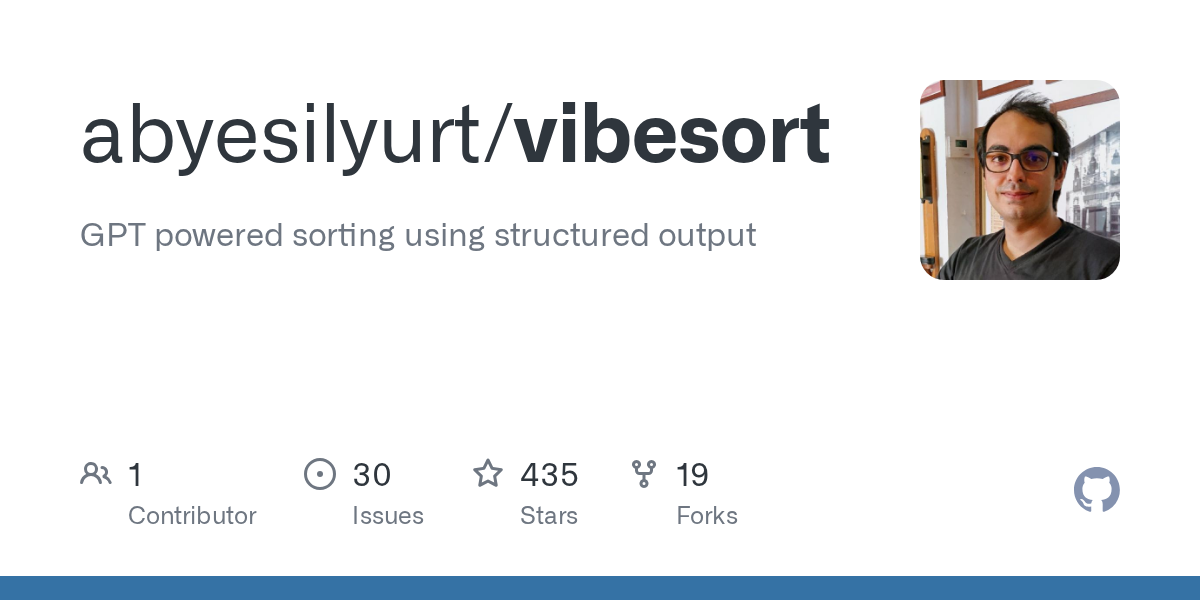 arrow-up1106arrow-down1external-linkVibesort: GPT powered sorting using structured outputgithub.comruffsl@programming.dev to Programmer Humor@programming.devEnglish · 2 months agomessage-square11linkfedilinkfile-text