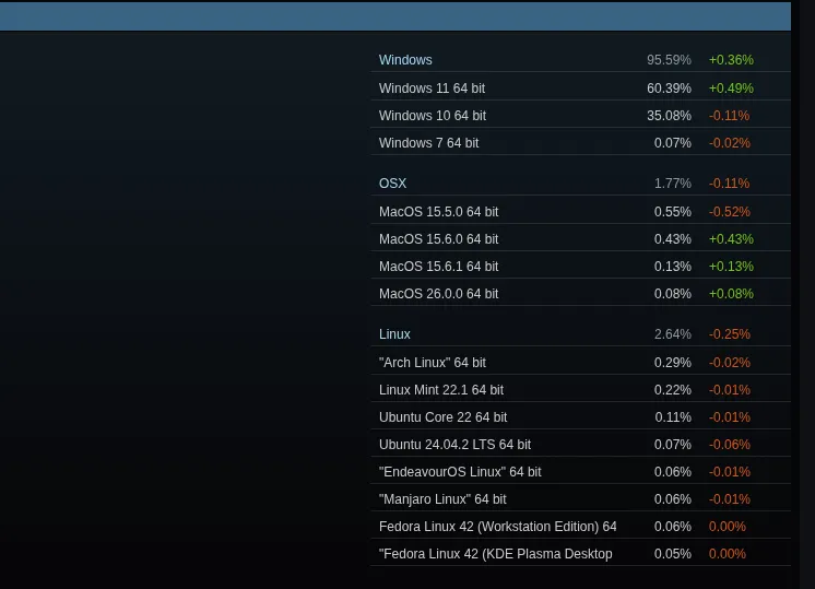 Going by a graph by the GamingOnLinux site, in the past 7 years, overall it has shown an exponential growth tendency. Plus previous surveys all are archived on sites like Internet Archive so they could do their own research. Given that, to me the headline already opening up with “recedes” sounds disingenuous, or at least a case of hyperfocusing on a detail without need, something I tire to see in other types of news. Plus they work on the text based on the headline, without checking or commenting on the tendency.