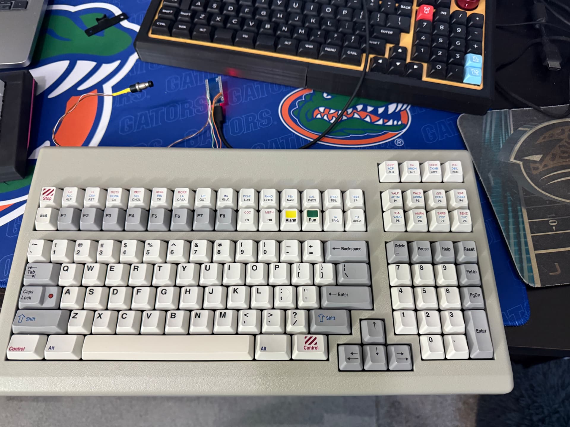 Keyboard from 2010 built by TG3 for a Siemens chemistry analyzer. I cleaned it up, added some weight to the bottom, and converted to USB. Cherry MX Black and PBT Dye-subbed DCS caps. Take a peek at what should be F9 and F10 (and are after conversion), as well as some of the keys above the numpad, which, tangentially, now has 5 keys that do absolutely nothing related to what’s written on them.