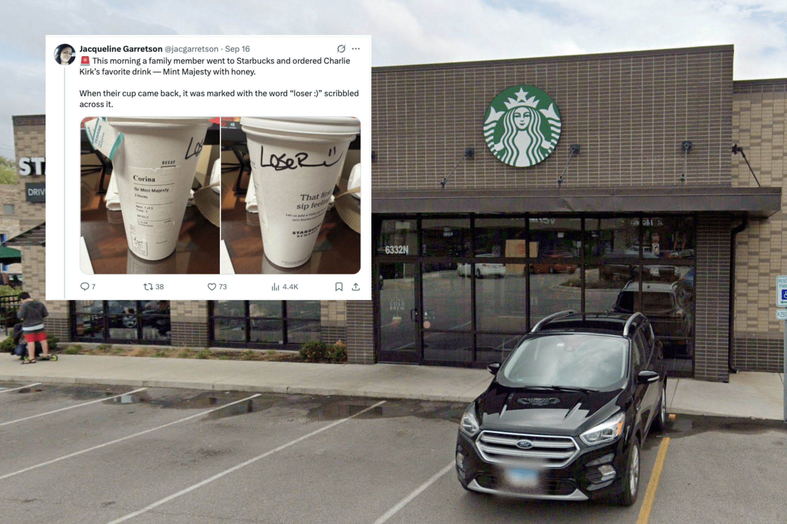 Garretson wrote that a relative, whom she later identified as her mother-in-law, ordered the Mint Majesty tea with two honeys — an order known to be Kirk’s favorite drink — from the Starbucks. When the order was completed, the cup had “Loser” written on it, Garretson said.