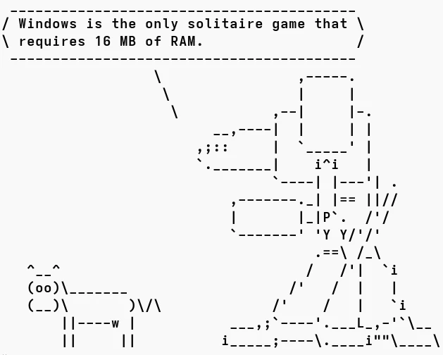 minus-squarebalrog@programming.devlinkfedilinkarrow-up1·2 months agoIt’s a cow. The ASCII art is used in a lot of different CLI projects