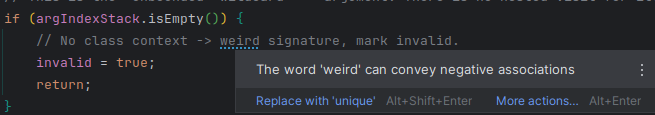 I never understood the pearl clutching that happens over code. If I leave a comment describing something as weird, and the original author gets offended somehow, that simply isn’t my fuckin problem.