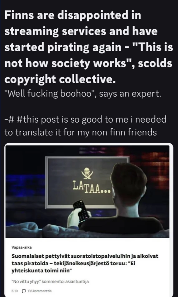 lanigerous@feddit.uk to Piracy: ꜱᴀɪʟ ᴛʜᴇ ʜɪɢʜ ꜱᴇᴀꜱ@lemmy.dbzer0.comEnglish · edit-226 days agoGood old Finland (subtitle is commentary, not in text)lemmy.blahaj.zoneimagemessage-square34linkfedilinkarrow-up1488arrow-down16file-text