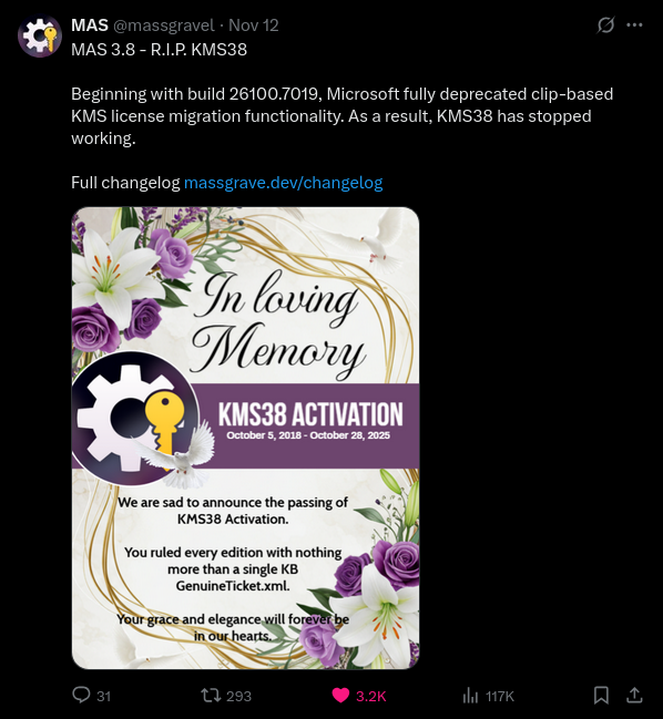 arrow-up1404arrow-down1imageMicrosoft has blocked Massgrave's KMS38 activation method for Windowslemmy.mlmr_MADAFAKA@lemmy.ml to Piracy: ꜱᴀɪʟ ᴛʜᴇ ʜɪɢʜ ꜱᴇᴀꜱ@lemmy.dbzer0.comEnglish · 19 days agomessage-square135linkfedilinkfile-text