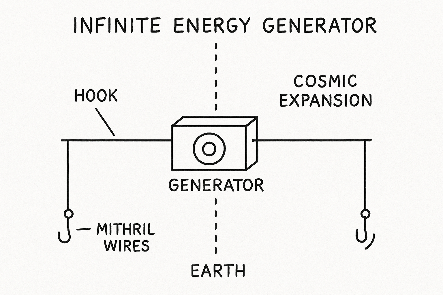 The way I understand it is that a remote body will tug on a mithril wire which turns a generator as it unspools. Alright, fair enough for a thought experiment on it’s own, but without any reciprocating action, infinite energy would require an infinitely large spool to unwind.