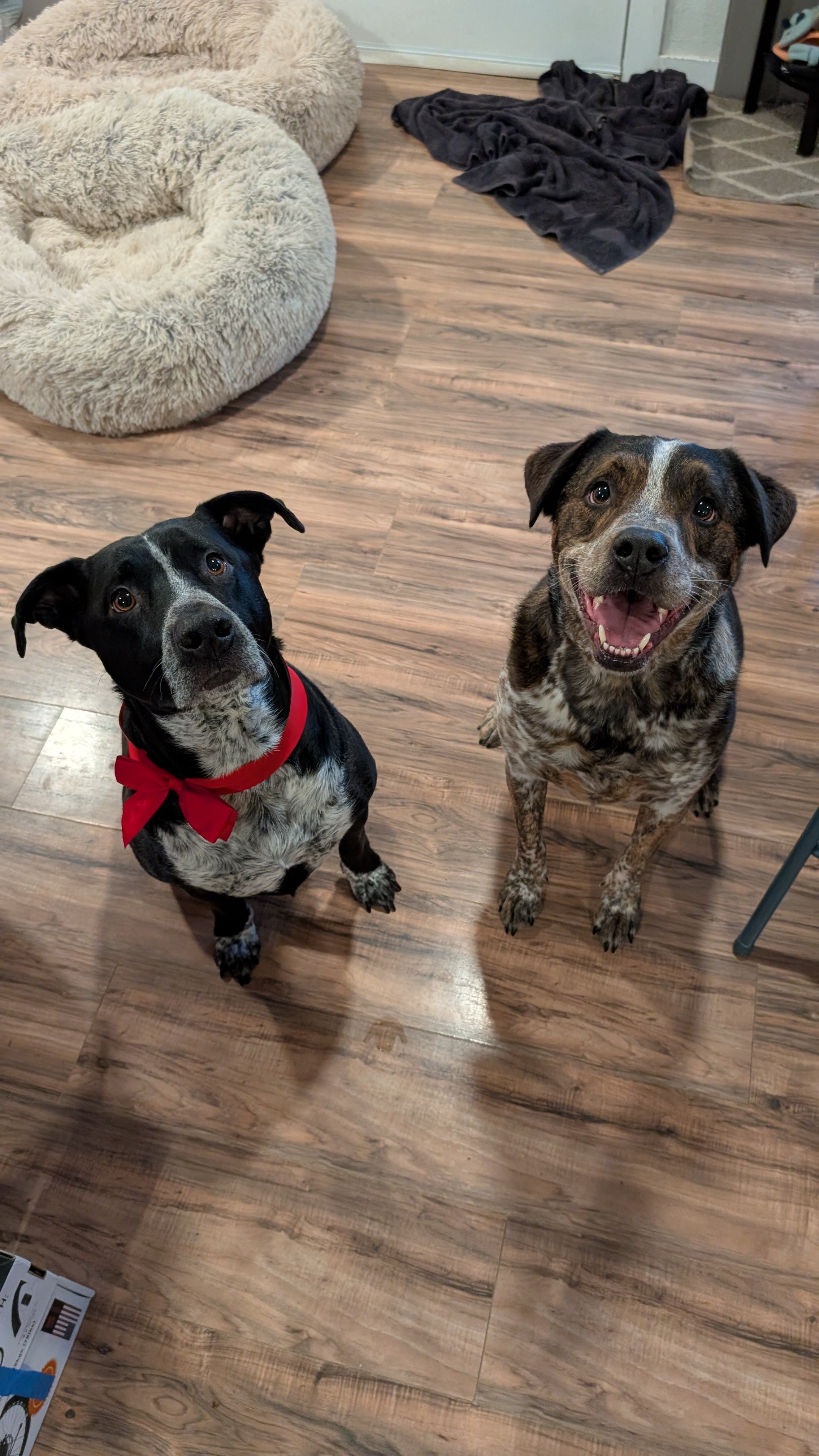 I first put the red bow on Ollie, the brown smiley one on the right. Bruno was not having it, and endlessly wrestled him and tried to pull it off. I finally took it off and put it on Bruno, expecting him to try and take it off himself.